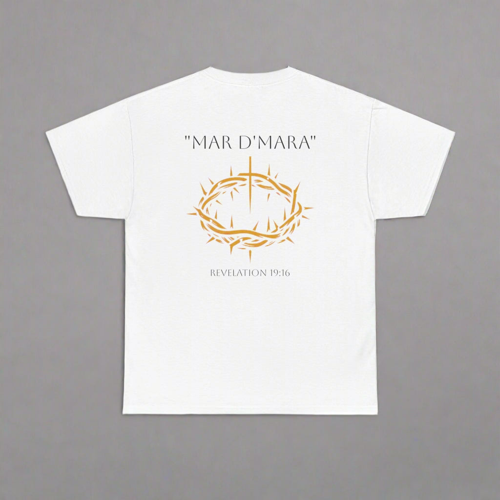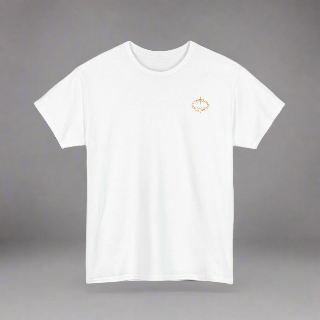 Day Edition T-Shirt featuring a Crown of Thorns design in gold, perfect for inspiring faith. The Aramaic writing can be translated to lord of lords, inspired by Revelation 19:16, "KING OF KINGS AND LORD OF LORDS." Made with 100 percent cotton, this premium tee is perfect for everyday wear and to boldly express your faith and walk by it. "For we walk by faith, not by sight." 2 Corinthians 5:7
